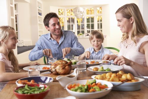 Familie på fire søges til en simpel scene, hvor I spiser aftensmad.