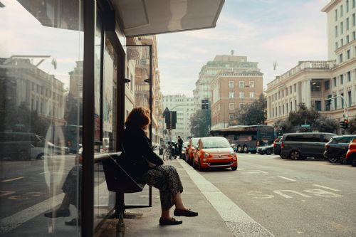 Afslappet, men let bekymret for timing. Hun tjekker bussen visuelt, scanner derefter sin mobil og slapper af.