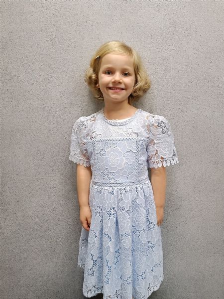 5-årig med fuld, tydeligt og modent sprog. Kæmpe ordforråd. Meget udtryksfuld.